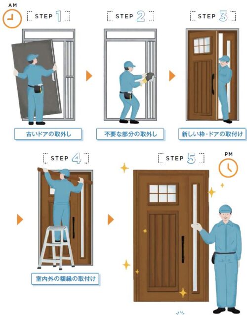 壁を壊さず、いまあるドア・引き戸枠に新しい枠をかぶせる工法ならたった1日で玄関ドア・引戸の交換ができます♪