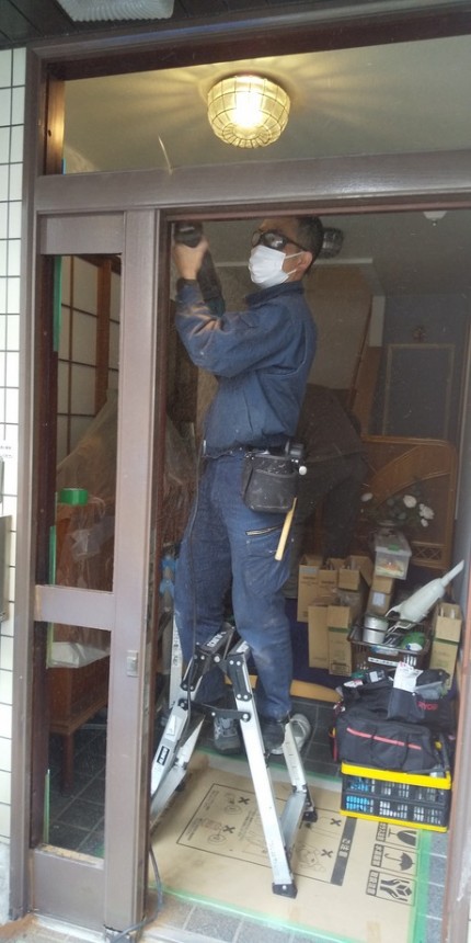 始めにドアを外して、欄間と袖を撤去するのですが木製の枠は太く丈夫で撤去するだけでも時間がかかってしまいました。