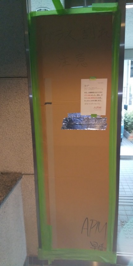 もし、ガラスが割れてしまった場合は、写真のように段ボールやテープなどを使って応急処置を行うのがいいでしょう。