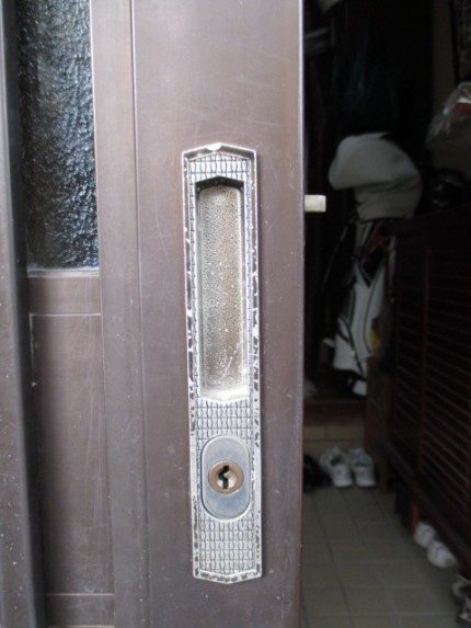 本日は、玄関引き戸の鍵の取替の下見にお伺いしてきました。