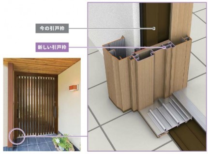 カバー工事は、写真のように既存の玄関枠の中に新しい枠を取り付ける方法です。
