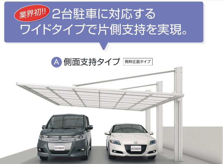 車を縦に2台置く場合は、色んなメーカーから発売されていますが、横に2台並べるカーポートで側面の柱が片側だけの物は
