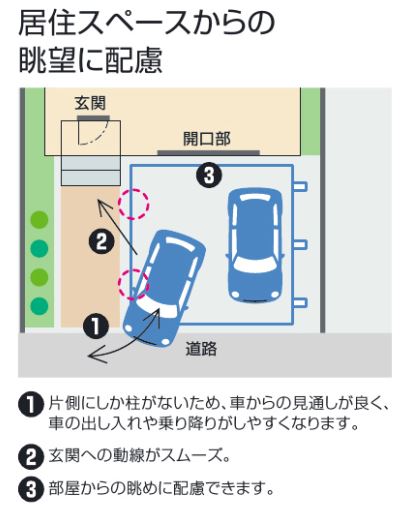 柱が片側にしか無い利点は、片側に柱が無い為駐車スペースが広く確保できるという点が一番だと思います。また、柱が無い方へはドアを大きく開けられるというメリットもあります。駐車スペースが1台分のお家に取付けて玄関までの通路も一緒にカバーするという使い方も出来ますね