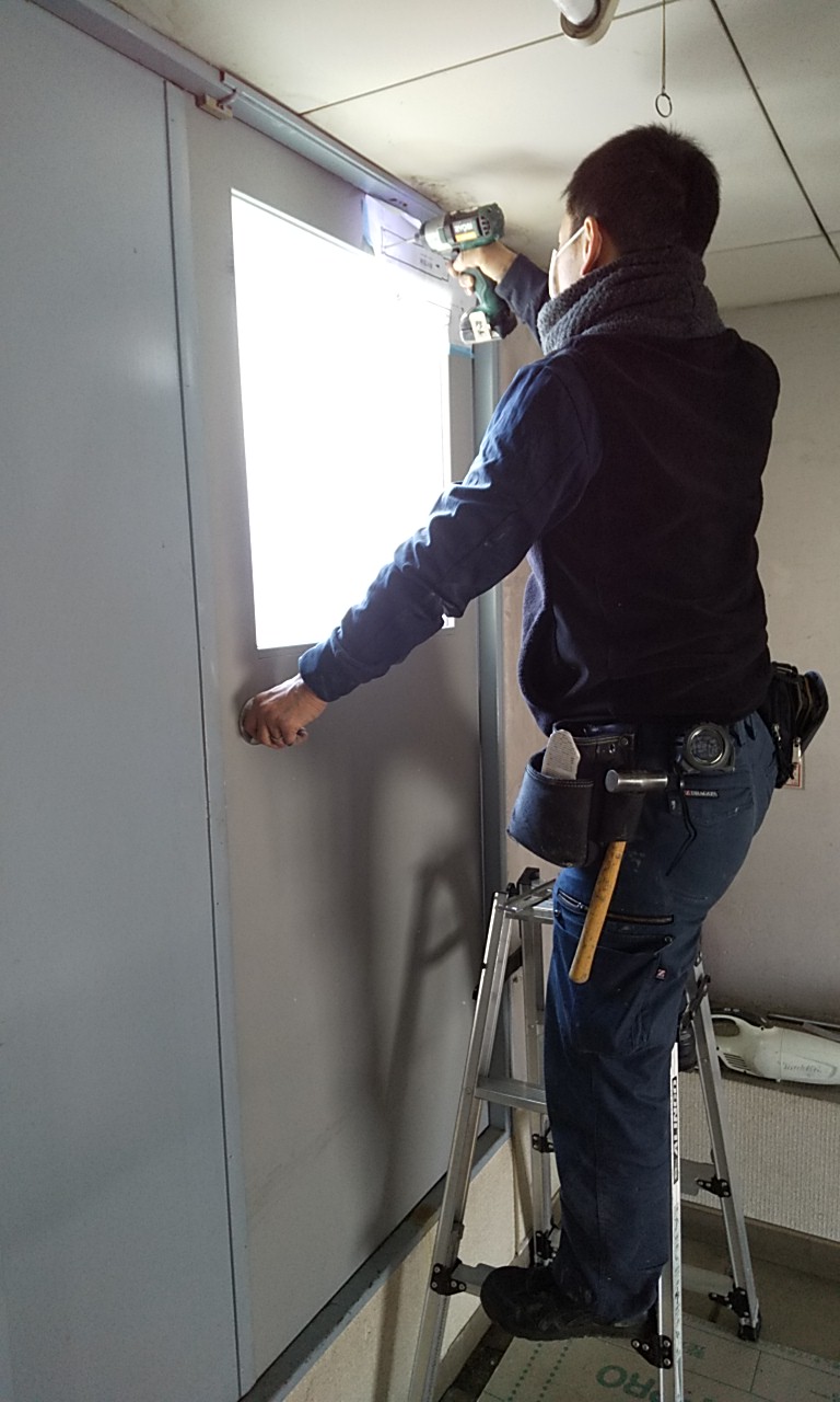 扉を吊りこんで、開閉に問題が無いことを確認したら新しいドアクローザーと取り付けていきます。