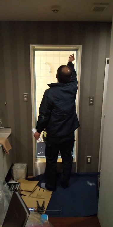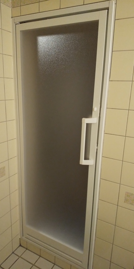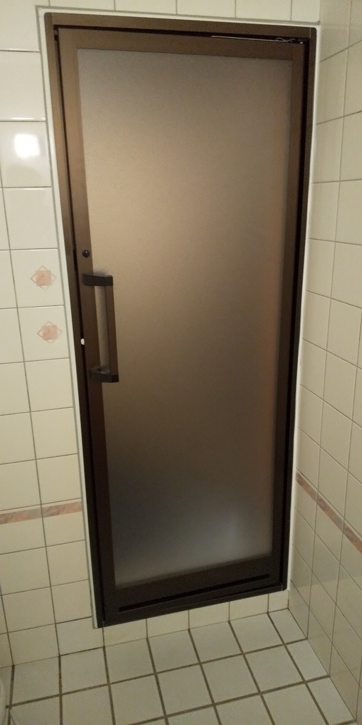 お客様から「ホテルの浴室ドアが傷んできっちり閉まらないので、取り換えて欲しい。」とご要望を頂きました。