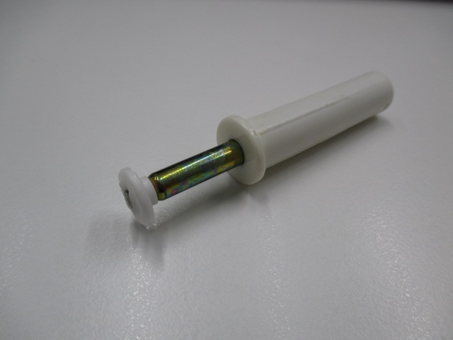 現物を確認すると、折れ戸のクローゼット扉の下側がレールから外れてしまっていました。そして扉の下側をよく覗き込むとガイドローラーの先のプラスチックが割れてしまっていました。写真は取り外した物ですが、写真の左側に本来は、2~4mmぐらい飛び出した部分があり、そこがレールのガイドになっています。
