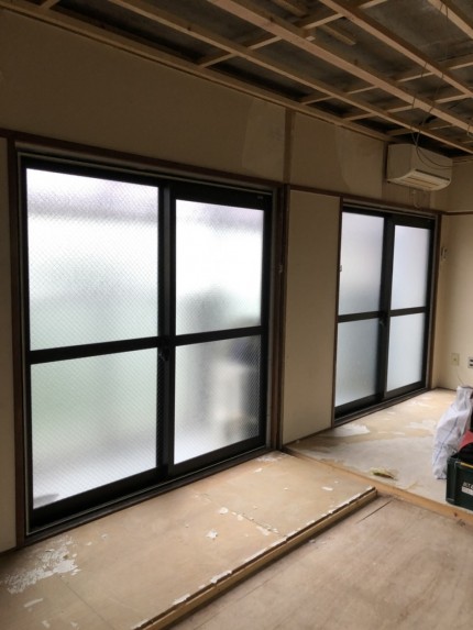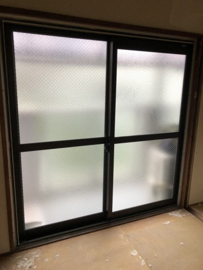 既存の障子部分(窓の開け閉めする部分)を撤去して、アルミの下地材を取り付けます。
