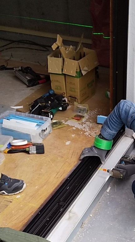 この時、枠に歪みがないように水平、垂直をレーザー墨出器で確認しながら取り付けていきます