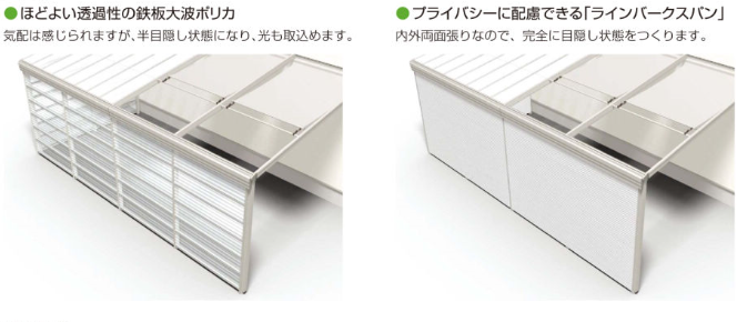 側面のパネルは、透過性のある波板ポリカか完全に目隠しになるアルミ製サイディングからお選び頂けます!