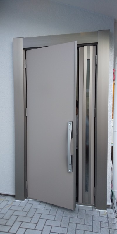 今回は既存のランマ付き片袖片開きドアからランマ無しの親子ドアにお取替え致しました