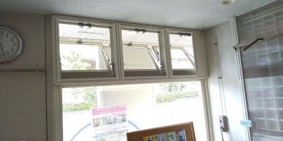 こちらは施工前の写真ですが、今回の窓で問題になったのが、排煙窓のオペレーターの配管が窓から壁に露出で配管されていた為、普通には網戸が取付出来なかったことです