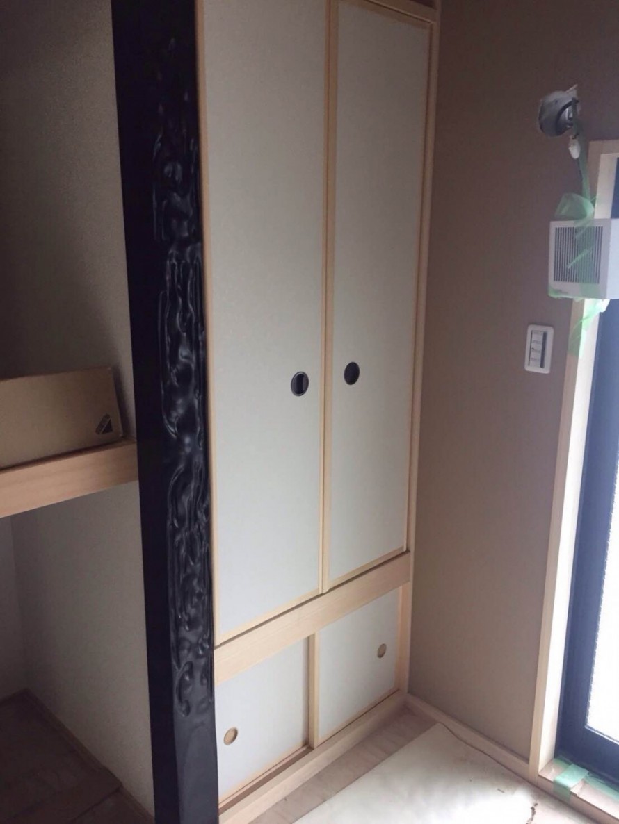 開口だらけの和室に襖(ふすま)や木製建具を設置後に見渡すと化粧柱とがアクセントとなって、とてもカッコ良く引き締まった印象を受けました