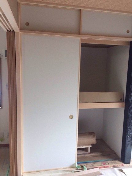 天井いっぱいまで収納できるように鴨居(かもい)上にも敷居(しきい)があり、襖(ふすま)を設置いたしました