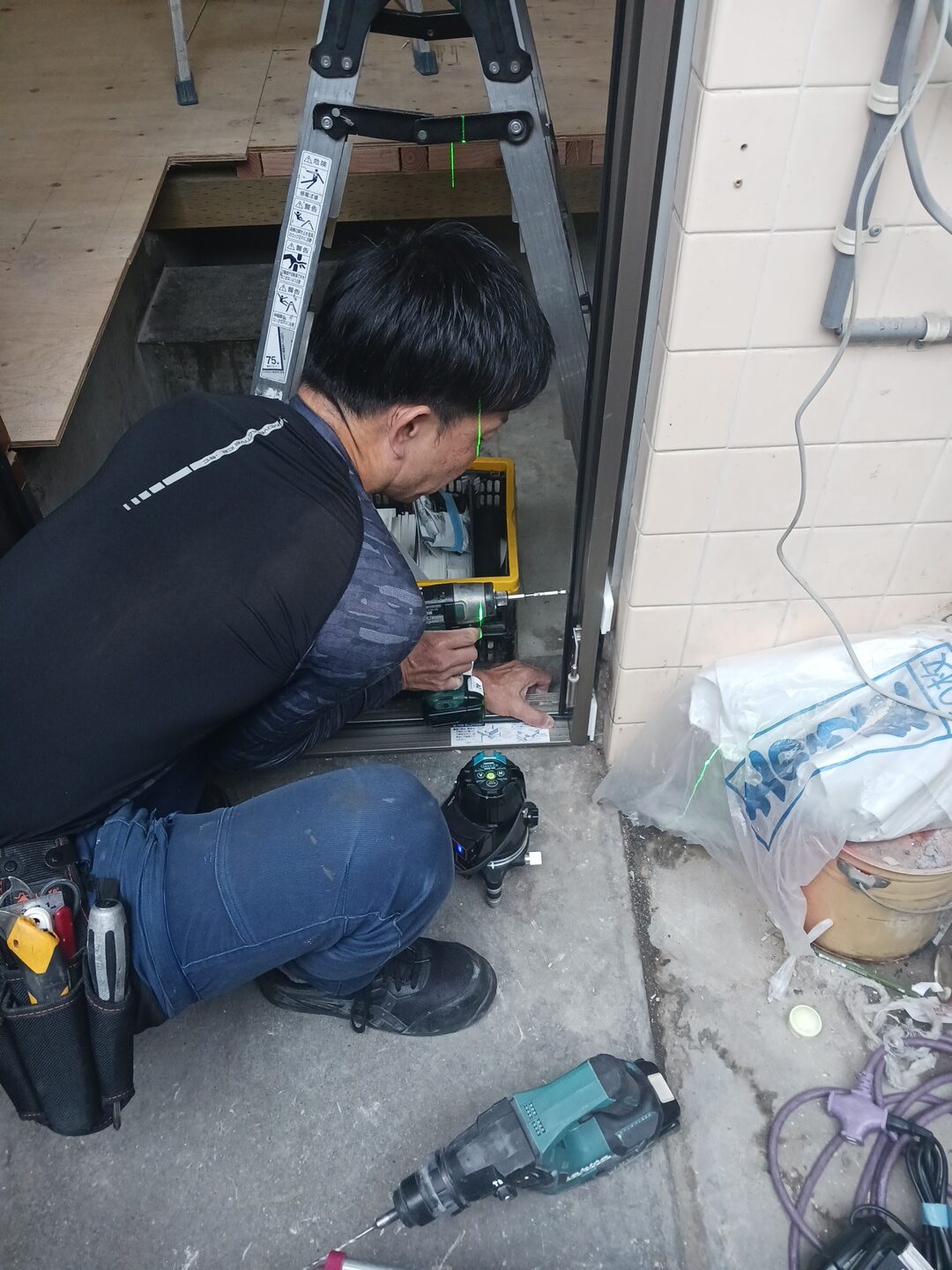 2枚目の画像が新枠をレーザー照準器を使用して垂直と水平を確認しながら取り付けている時の画像になります。