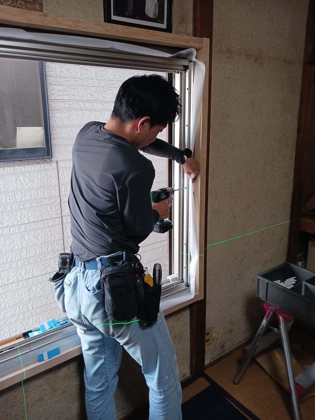 その後、新窓に付属している防水シートを旧枠内に張り付けていきました。
