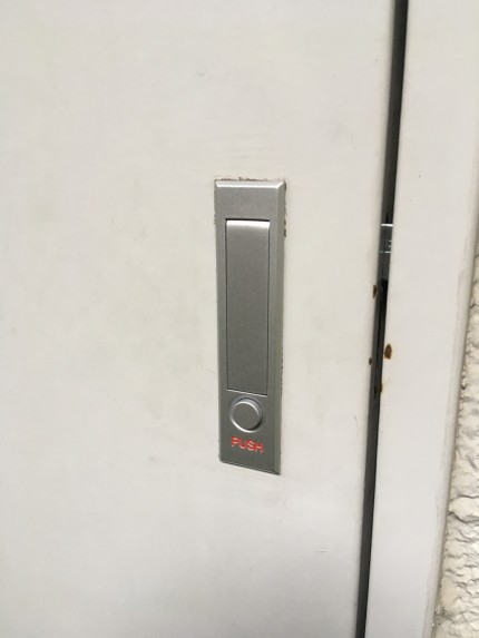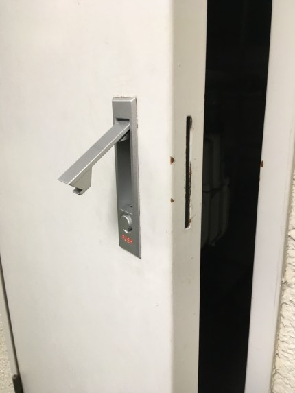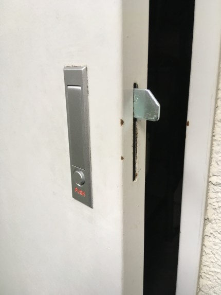 鍵をかけると画像のようなヒレが戸先から出てきまして、扉が固定される仕組みになっております