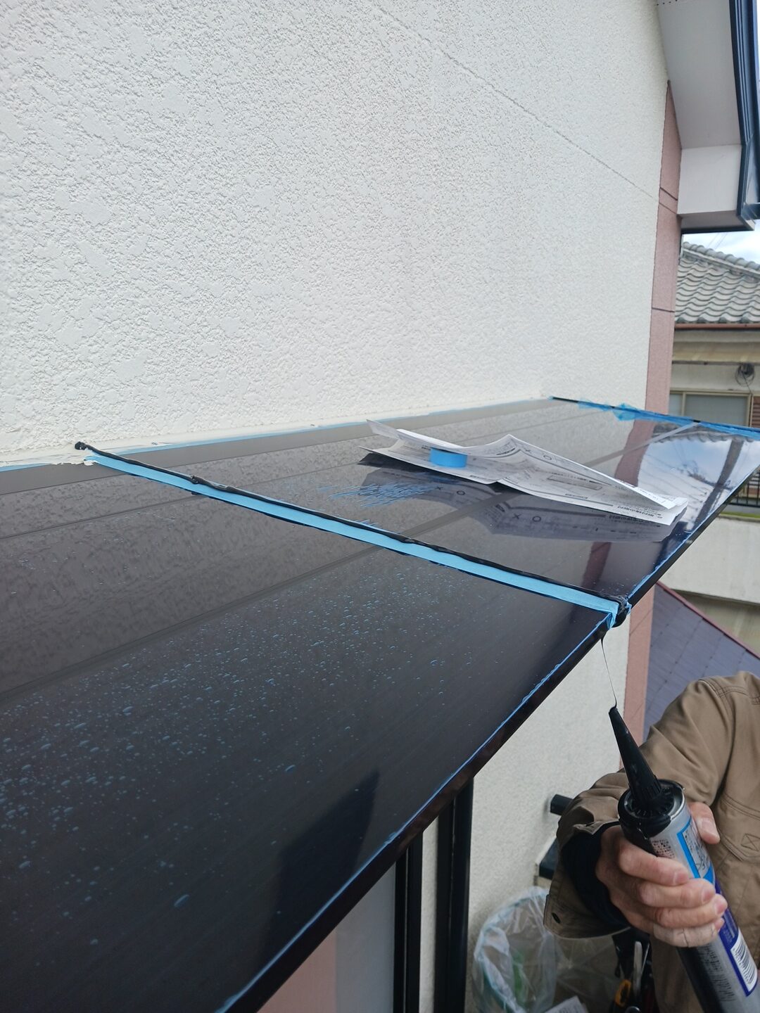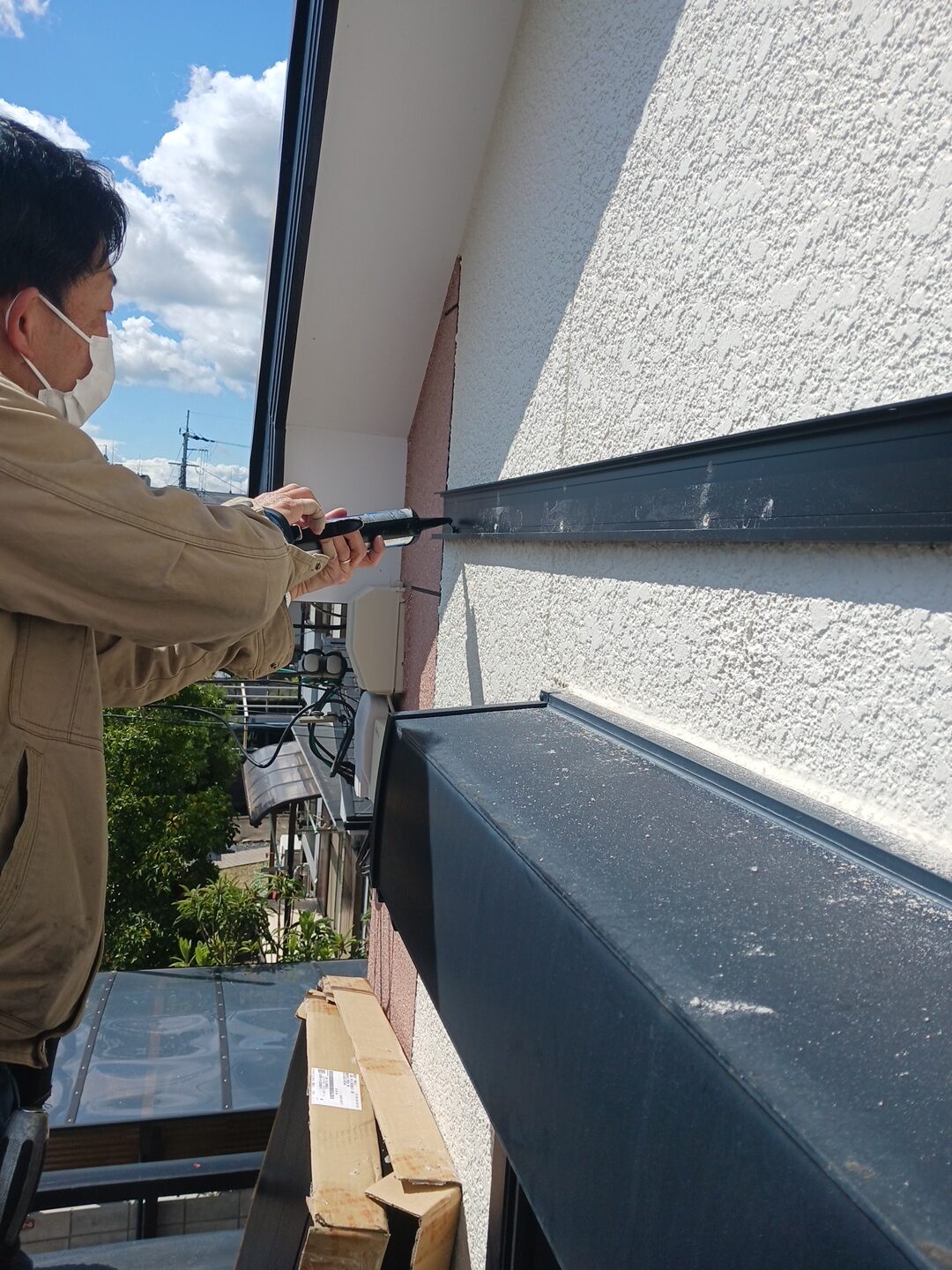 その後、庇と壁面との取り合い部と2連の合わさり部分にコーキングを施していきました。