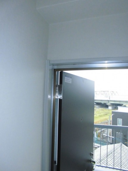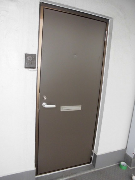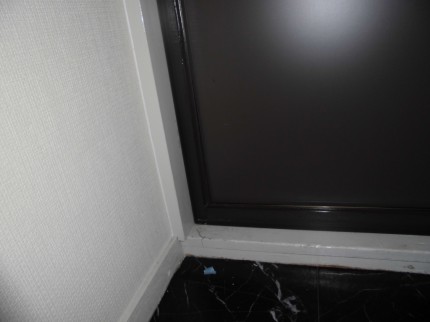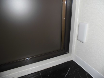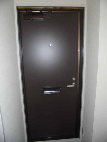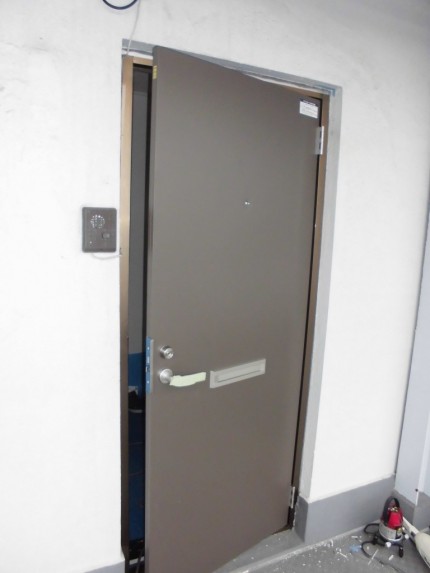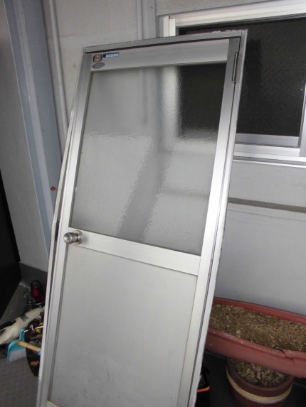 古くなったドアの取り替えでした、シルバーのドアがついていました、そのドアをはずしてから、新しい枠と、ドアを取り付けていきます。