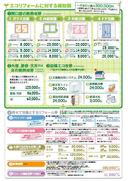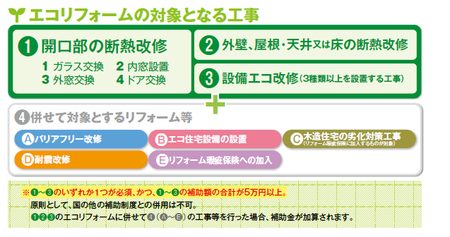 上記の3つがエコリフォームの対象工事です。その他にバリアフリーや耐震改修などをすると、追加で補助金に加算されます。