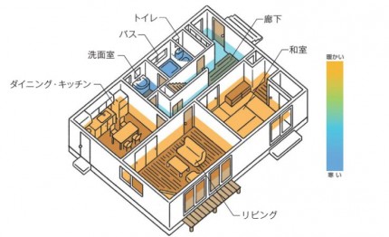 リビングやダイニング・キッチンなど暖房がついている部屋と暖房設備のない洗面・バス・トイレ・廊下とでは、10℃以上の温度差がある場合も!!