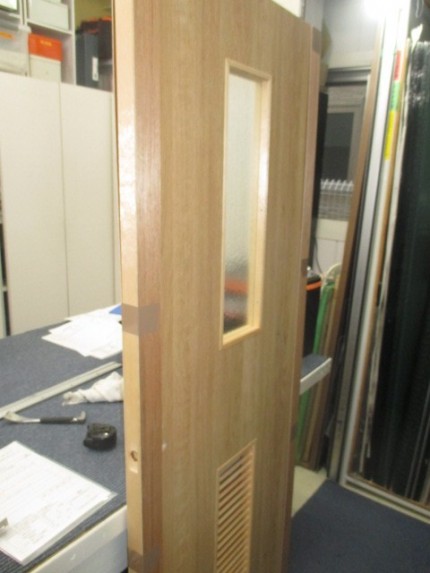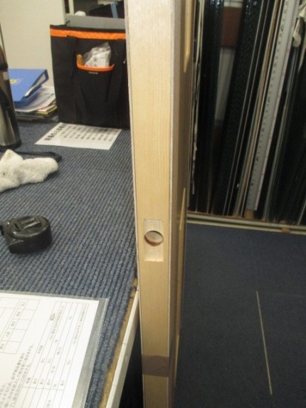 木製建具のガラスを入れるのと、金物取り付けしました、まず寸法をはかり、ガラスをカットします、で、建具のガラス抑えをはずします。 ガラスをはめ込み抑えをビス止めしていきます。 金物を取り付けていきます、加工されている穴を金物が入るように削ります、それから金物を取り付けビス止めします。この建具は鍵つきでした。 いい感じ。