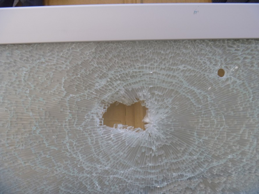 2回目にはガラスドアの端を狙って振り下ろしてみると、簡単にガラス端からヒビが入り、ハンマーが当たった部分だけガラスが粉状に割れました