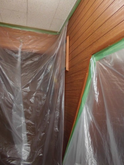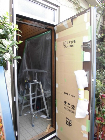 まずは養生からです、リフォーム玄関の場合、古くなった枠を、取り外さないので、比較的ほこりは、そんなにはひどくは出ませんが、念のために養生します。