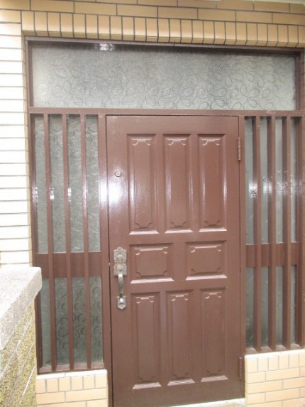 今回は こちらの 玄関の お取り換えです 両袖の ランマつき 玄関です。 歴史を 感じます。