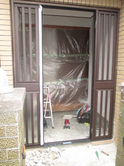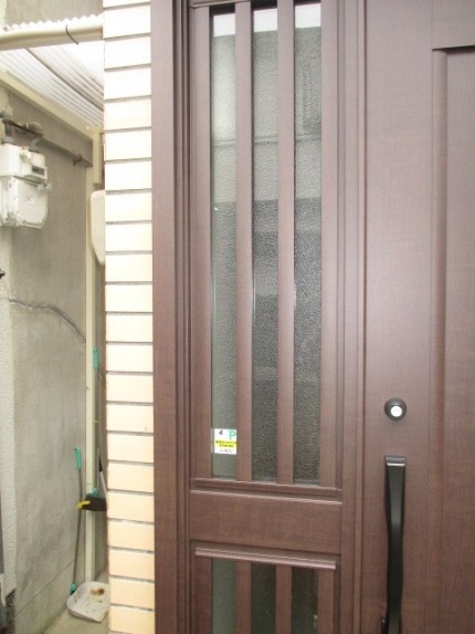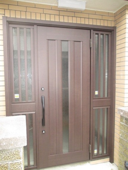 外観も 額縁を とりつけ コーキングをし ドア ガラスを を いれて 調整し 完成です。 立派な 玄関です。カッコイイな~ 次の 画像を ご覧ください。