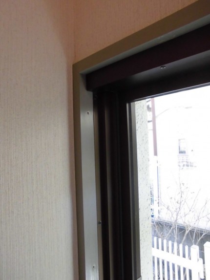 内額縁を取り付けていきます、内側上部を見ていたきうと、四角い箱みたいなものがついているのが、解りますか? こちらが、内額縁の上の部材になります、寸法をはかり、カットして取り付けていきます。