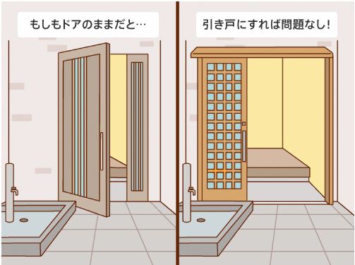解決策として、当社が提案するのが、玄関ドアを引戸に取替える事です。手前に引くドアと違い、引戸なら横にスライドするので、洗い場があっても開閉の邪魔にはなりません。