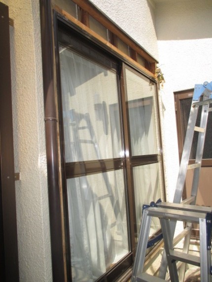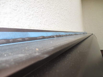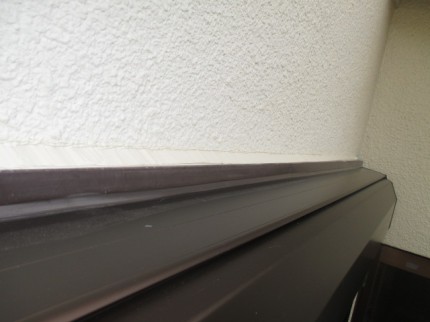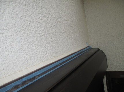 取り付けてから枠周りをコウキングしていきます、画像では見にくいですが白い壁の部分も白い変性コウキングをしています。 青いテープのところは前の部分のところなので枠と同系色のコウキングを打ちます。