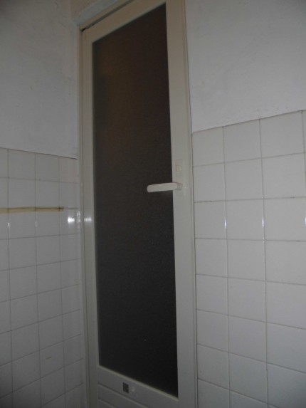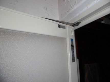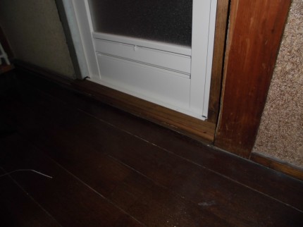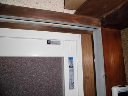 脱衣場からの写真です、引き戸のレール、戸先の部分に、木材をいれて、取り付けていきます。