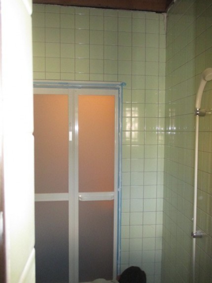 こんにちは、今回のご依頼は浴室折れ戸の交換修理です、浴室の折れどが、壊れた時は、この方法が、コスト面で有利です。 最近の折れどは、換気口、ガラス部が、樹脂パネルで、万が一割れても安全になっています、それと、折れどで、心配なのが、浴室の中で気分が悪くなられた場合、中に人がいるのであけにくい場合がありますが、考えてあります。 非常解錠ボタンを 両方下げてもらえば扉を折らなくてもあけられます。 安全ですね。 今度、浴室の入り口をリフォームされようと、お考えの、お客様におすすめです。 この写真は、古くなった折れどを、取り外し、新しい枠をはめ込み、かりにつり込み、隙間を確認して、コーキングのための、テープを貼っているところです。