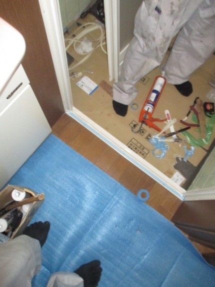 今回は、新人のタツキ君と、同行で、彼に取り付けのコツを、伝授しています、浴室のドアの取り替えなどは、水漏れが心配ですので、コーキングをしっかりといれていきます。