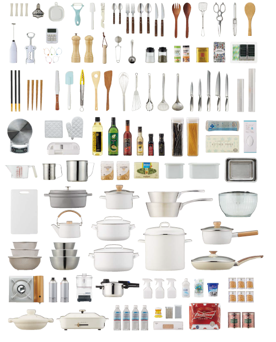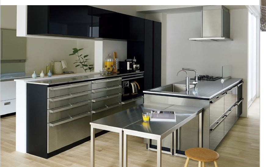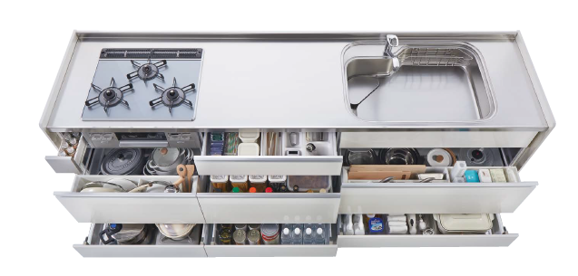こんなにも入っていて驚きますが、最新のキッチンならばもう少し入るかもしれません。キッチンは本当によく考えられた収納家具ですね。引出タイプのものはよく使うものが簡単に取り出せるように工夫されています。足元はストックゾーンになっておりあまり使わないものをしまうのに適しています。上から収納した物を見渡せるのが引出タイプの魅力です。キッチンはもともと「台所」と呼ばれていました。「台所」とは生活空間から独立して料理などをするための場所としてとらえられていたように思います。昭和の高度成長期にDK=ダイニングキッチンの誕生で食卓との境界が緩くなりLDKという考え方が主流になりリビングの中心の位置づけになりました。お料理をする人は、リビングの中心にいることになり、料理だけでなく家族の集まる場所になりました。キッチンは家族の集まるコミュニケーションの取れる大事な場所になりました。キッチンの広さや家族の生活習慣にあった生活動線を考えたレイアウトにすることが重要です。