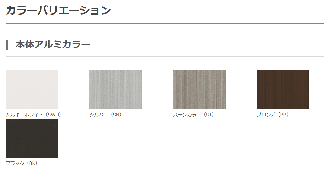 本体のアルミカラーは5色よりお選びいただく事が出来ます。