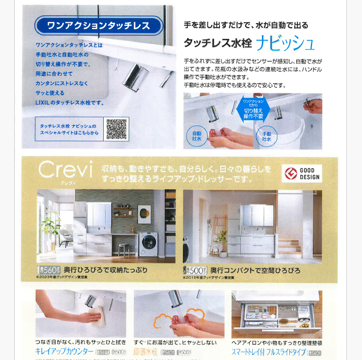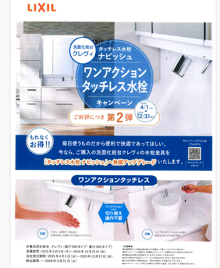 LIXIL 洗面化粧台 クレヴィ タッチレス水栓 ナビッシュ ワンアクションタッチレス水栓 キャンペーンのお知らせです。2025年4月1日~2025年12月31日まで ご好評に付き 第2弾 キャンペーンを行います。毎日使うものだから便利で快適であってほしい。今なら、ご購入の洗面化粧台クレヴィの水栓金具を「タッチレス水栓ナビッシュ」へ無償アップグレードいたします。自動:手を差し出すだけで、水が自動で出るワンアクションだから切り替えの操作不要です。手動:コップやバケツへの水くみなど連続吐水には手動で便利です。