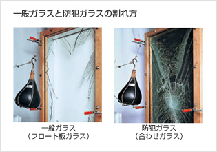 一般的なガラスは、衝撃を加えれば粉々に飛び散ってしまいますが、防犯ガラスはひび割れは起こしますが、飛び散って貫通する心配はありません。