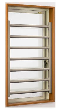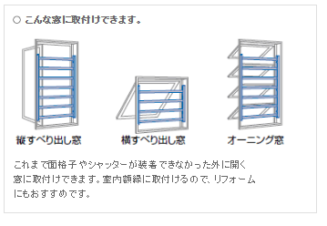 すべり出し窓やオーニング窓等、通常では、面格子が取付け出来ない窓でも室内側からなら、取付け可能です。