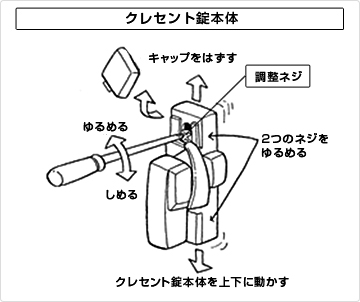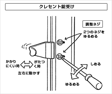 ドライバーで調整ねじを緩めると、クレセント錠本体は上下に、受けの部分は左右に動きます。
