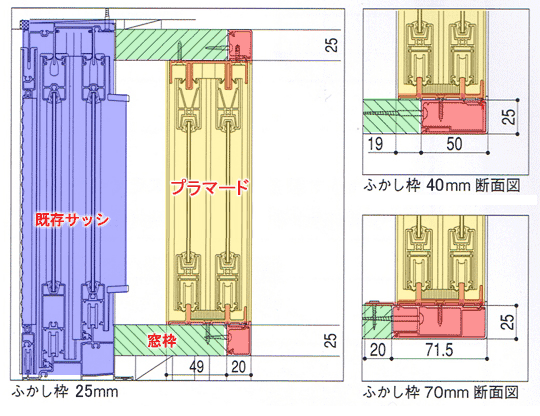 通常、内窓は取付け面の見込みが70mm前後必要になります。しかし、窓額が狭く70mmに満たないというケースも見受けられます。そんな時に「ふかし枠」を取付け、内窓が設置出来るだけ、取付け面を増設します。YKKAP プラマードUでいえば、25、40、70mmと種類があり、40mm以上のふかし枠には補強材が必要になります。メーカーによってふかし枠の寸法は多少違ってきます。