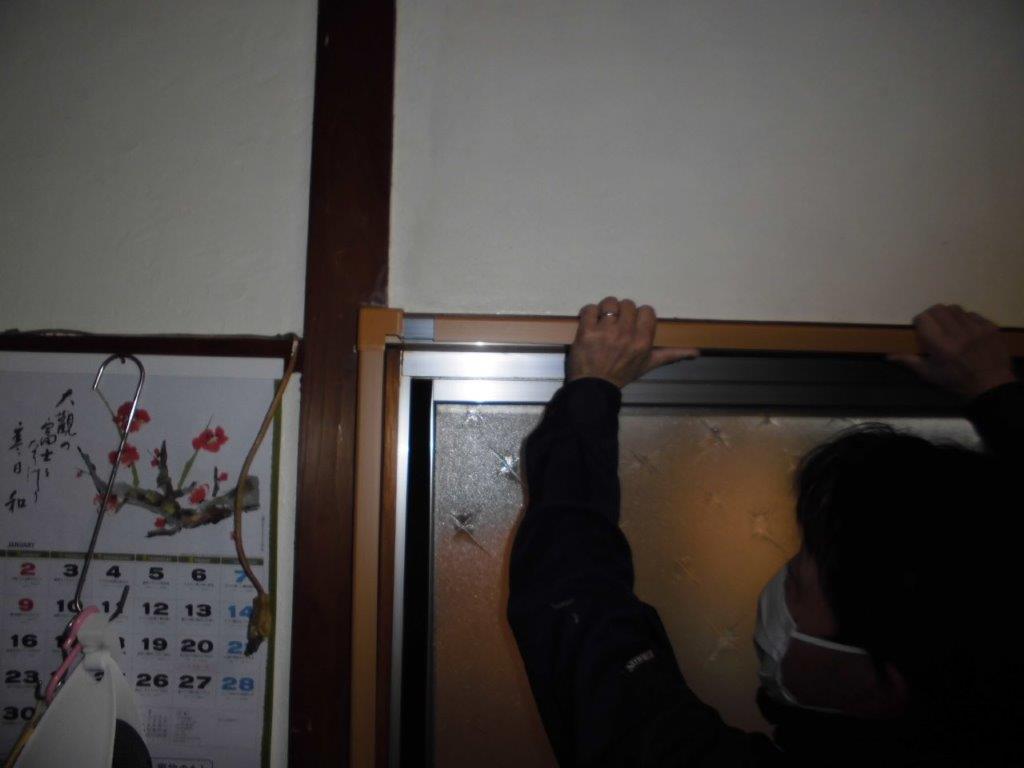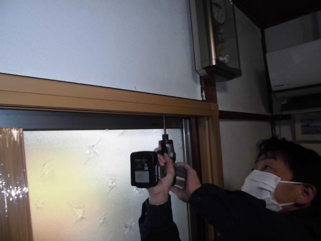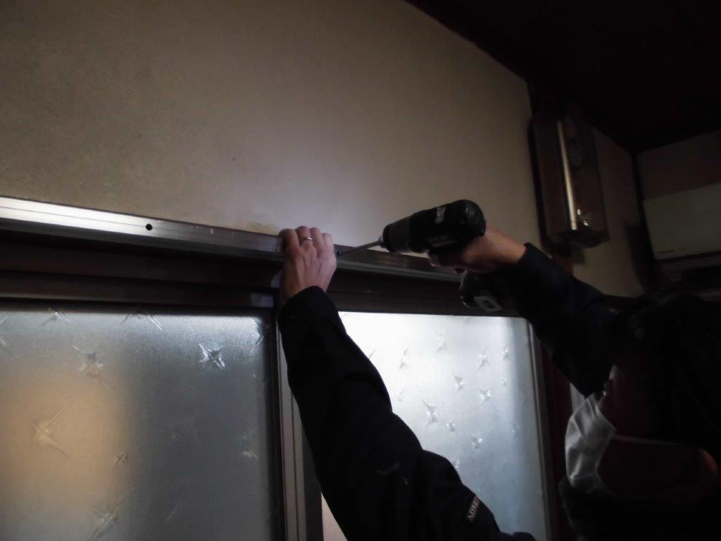 施行中⑦上部枠をビス止めしている所です。その後、下部レールをビス止めして枠の取付完成です。