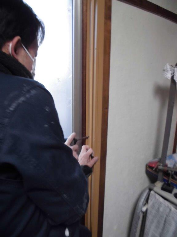 ご自宅掃き出し窓サッシ(巾1.7m高さ1.8m)からの冷気で寒くて困っていますので、2重窓を取付て欲しいとのご相談が有りました。現場に伺い採寸しました所、窓枠が30㎜しか無い、下にタタミが有る現状でした。2重窓取り付けるには70㎜強窓枠が必要ですので、今回、メーカーオプションのふかし枠40㎜を使用しなおかつ、タタミに干渉しない様、下部に20㎜厚の材木を使用し2重窓を取付するようしました。写真は下部に材木を取付している所です。