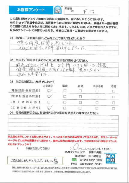昨年、プラマードUを2ヶ所つけて頂いた結果、防音、隙間風を防ぐことが出来、良かったので追加を希望した。