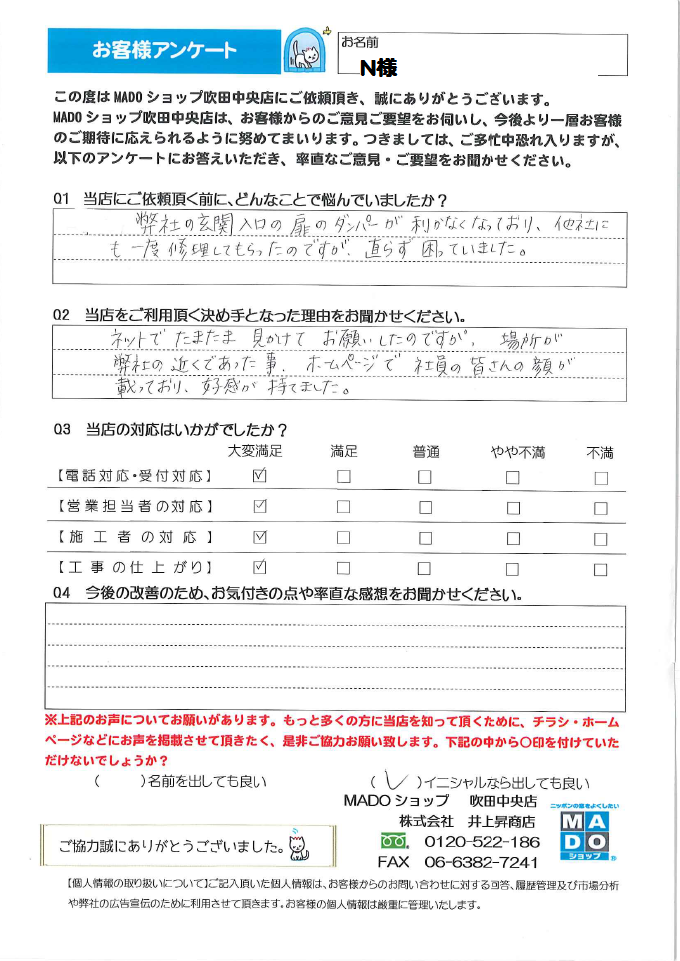 玄関入り口の扉のダンパーが利かながくなっており、他社にも一度修理してもらったのですが、直らずに困っていました。