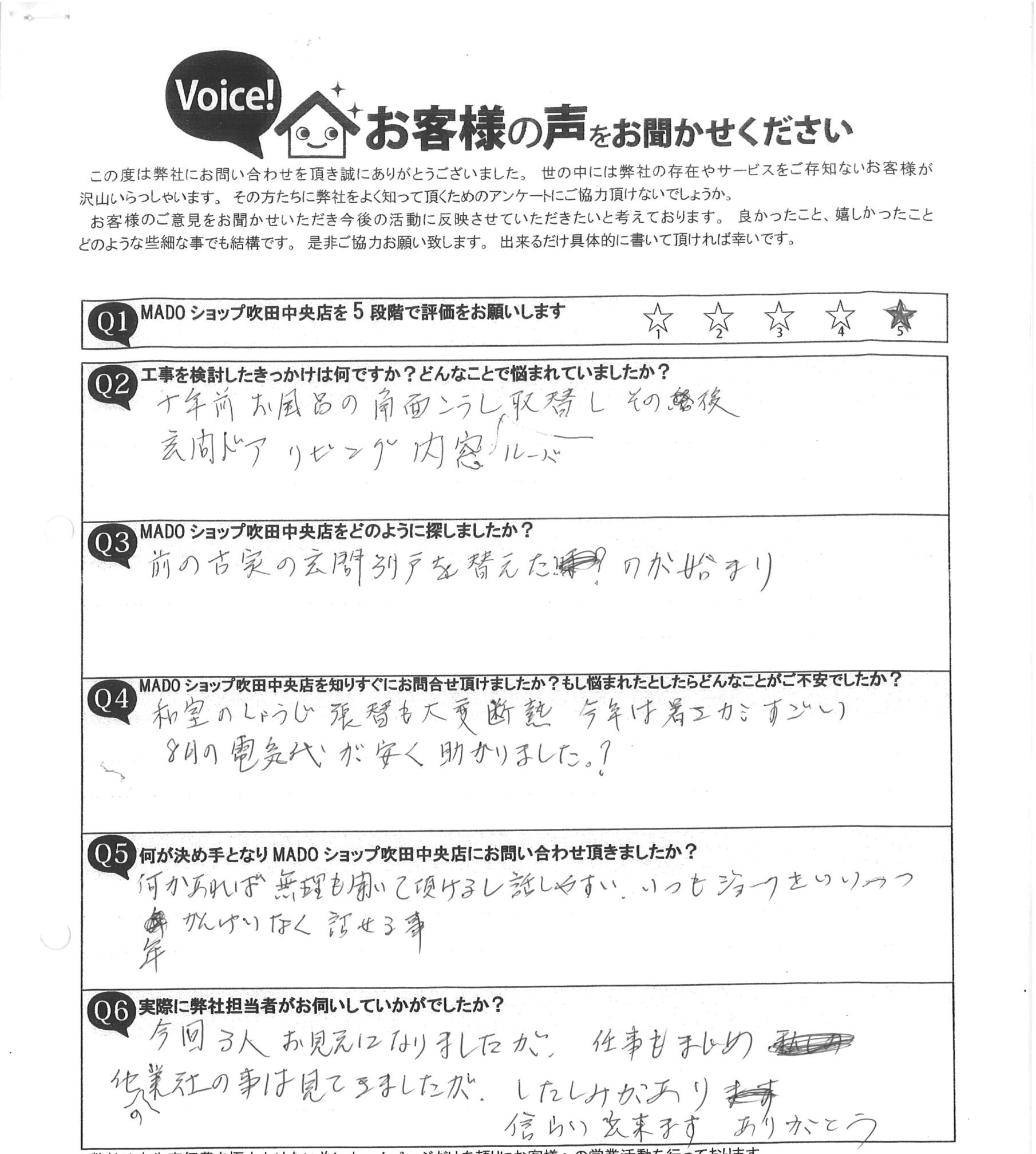 吹田市玄関ドア内窓工事のお客様からのご感想