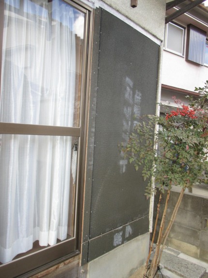 取外した戸袋跡に外装内装下地材「ラスカット」を固定しました。この下地材を取付けてから左官をし、左官後にシャッター枠を取付ける流れになります。