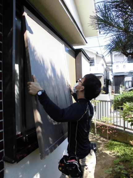 施行中① 既存の雨戸を職人が1枚ずつ取り外していきます。