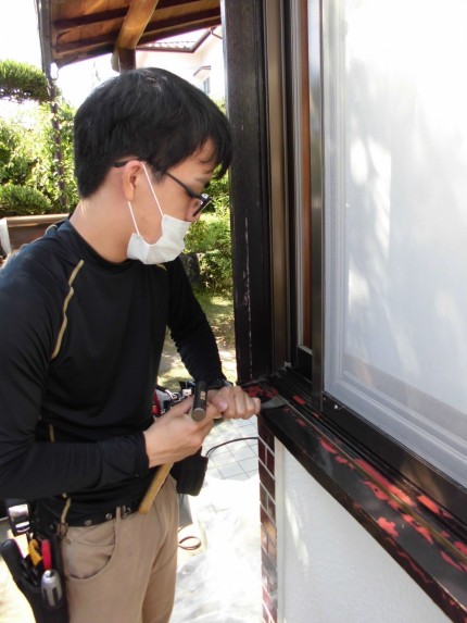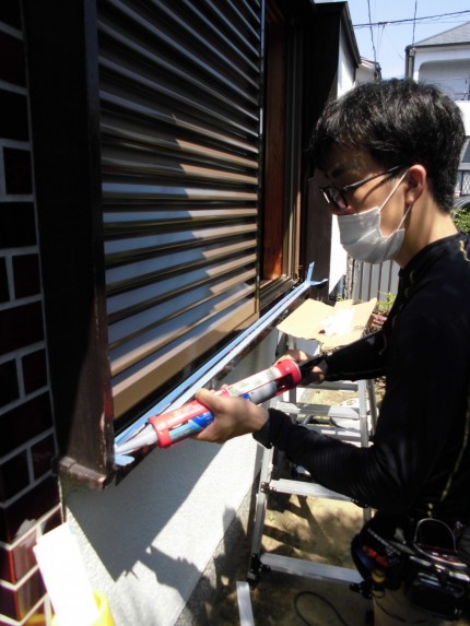 施工中⑨ 雨戸の開閉に問題が無ければ、新設雨戸のレールと既存枠に出来た隙間に防水の為コーキング処理をしていきます。